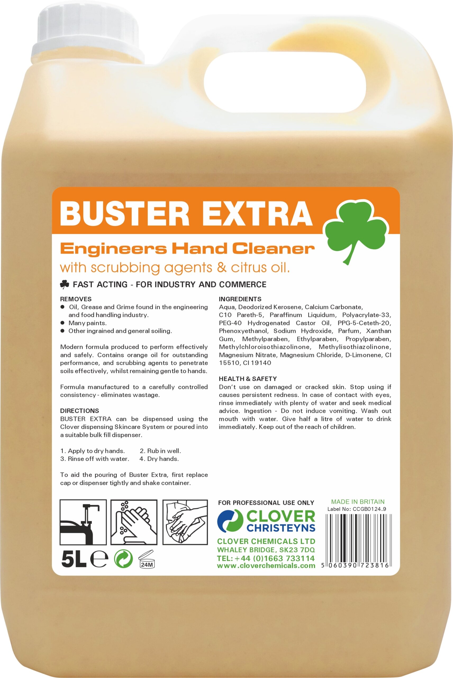 An orange scented hand cleaner, which contains scrubbing agents for added cleaning power, Buster Extra has been manufactured to a carefully controlled non-drip consistency.